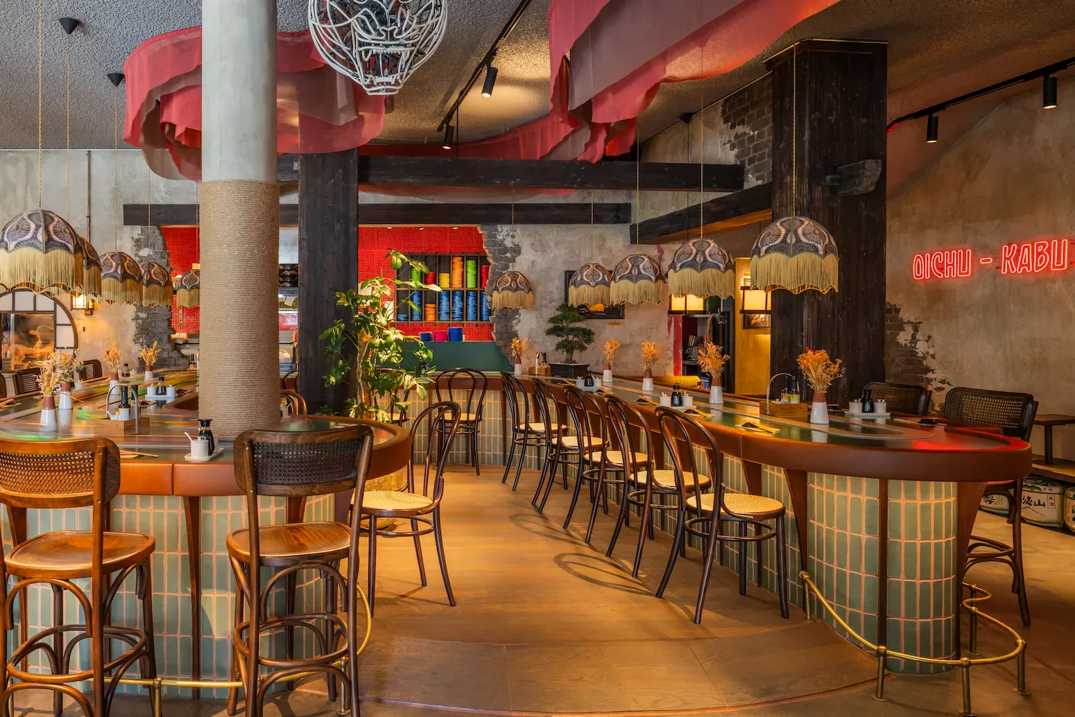 Um der starken Präsenz des Sichtbetons eine ausgewogene räumliche Qualität entgegenzusetzen, wurde mit gezielten grünen Elementen und natürlichen Materialien gearbeitet. Pflanzeninseln sowie Oberflächen aus Eiche und Leder ergänzen die bestehende Struktur, ohne mit ihr zu konkurrieren.