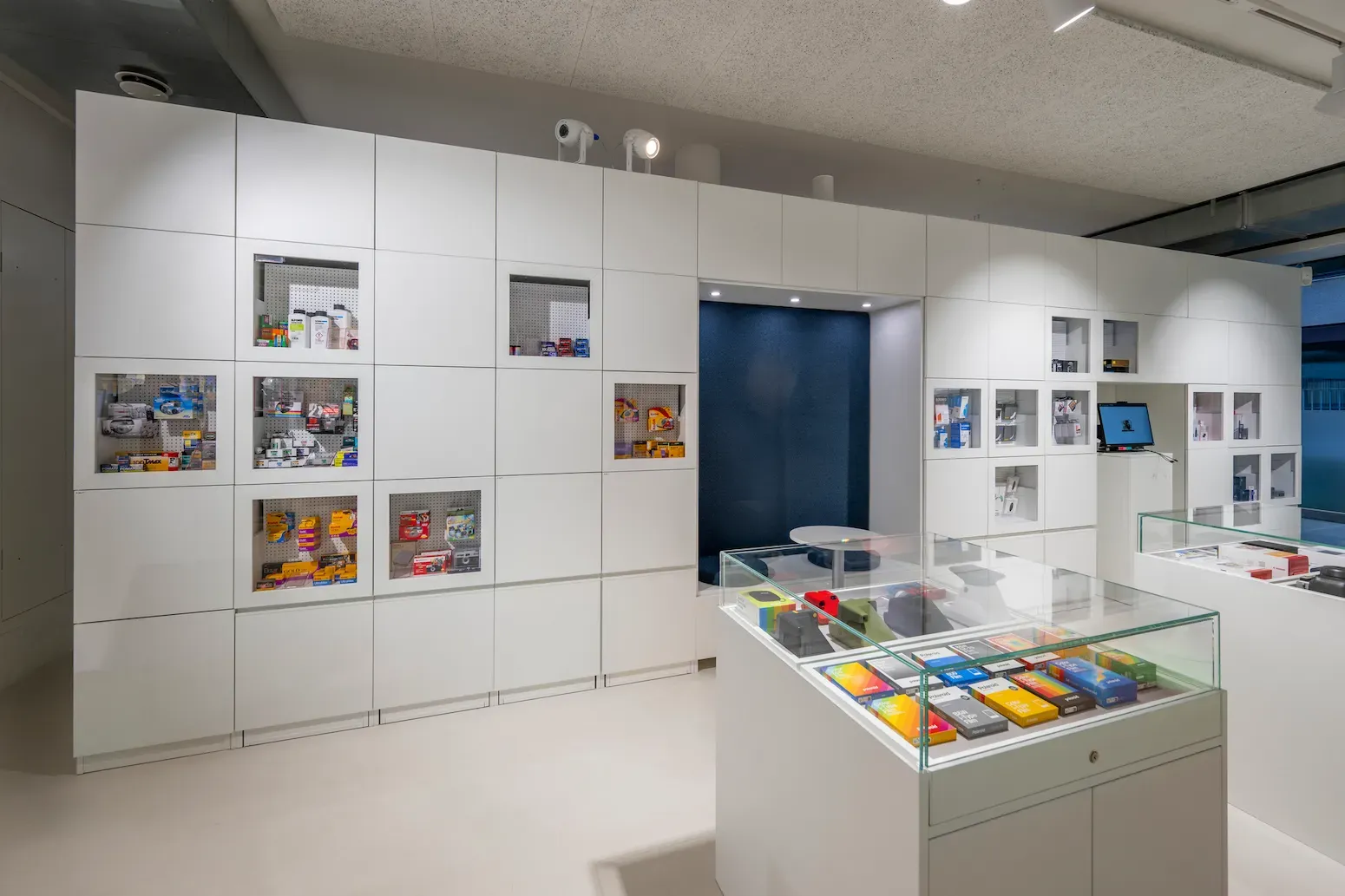 Die Architektur tritt zurück – damit Produkte sprechen: Beleuchtete Glasvitrinen präsentieren Kameras auf Augenhöhe, schlichte Sockel halten Ordnung. Im hinteren Bereich setzt das Schubladensystem wenige, gezielte Glasfronten als Highlights. Modulare Stellwände mit Lochstruktur ermöglichen eine frontale Präsentation – flexibel anpassbar an Neuheiten, Bestseller oder wechselnde Sortimente.