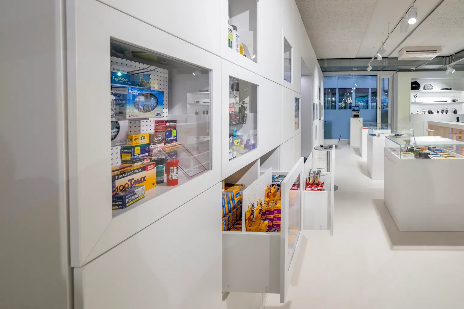 Inspiriert vom Fotolabor – übersetzt in Raum: Die farbigen Reflexionen der Glasfolien erinnern an Laborlicht und Farbfilter und schaffen einen Look, der sofort Wiedererkennung auslöst. Das Ergebnis ist ein Store, der nicht nur Produkte zeigt, sondern Fotografie atmosphärisch erfahrbar macht.